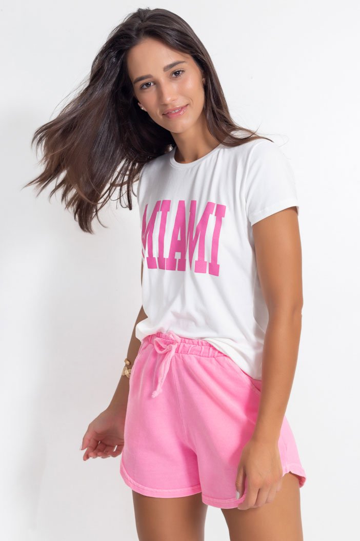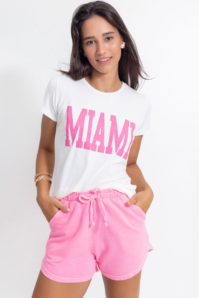 Composto por t-shirt suedine, com toque super macio, com estampa Miami em rosa neon , muito confortável e estilosa.