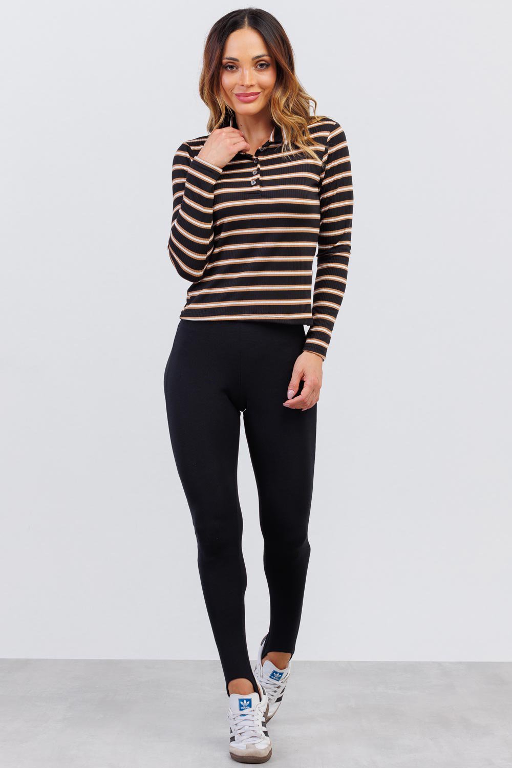 BLUSA FEMININA LISTRADA ANDREIA PRETO/CARAMELO