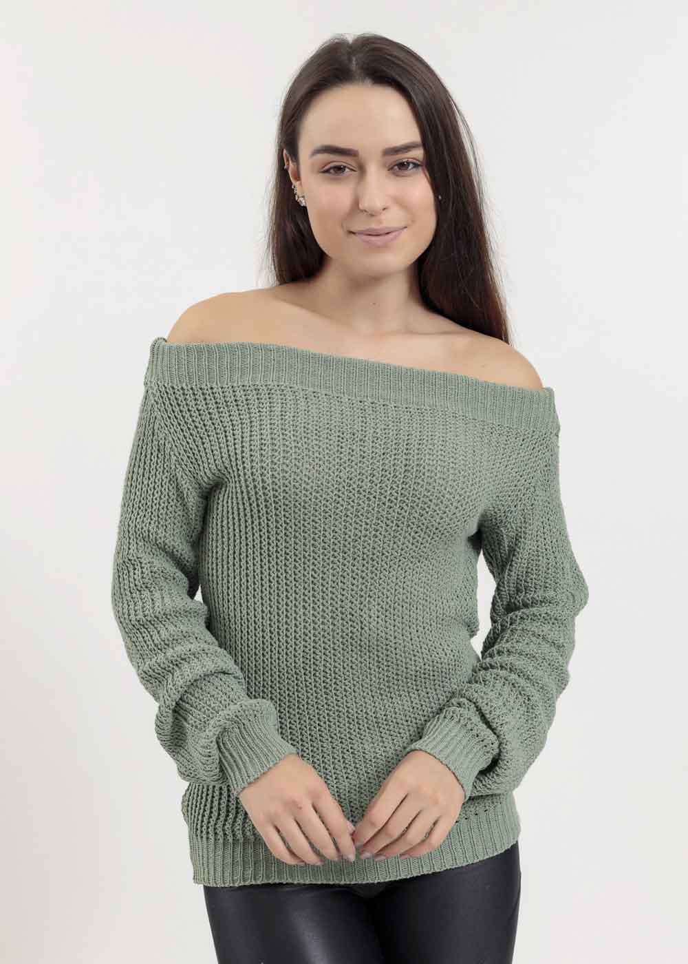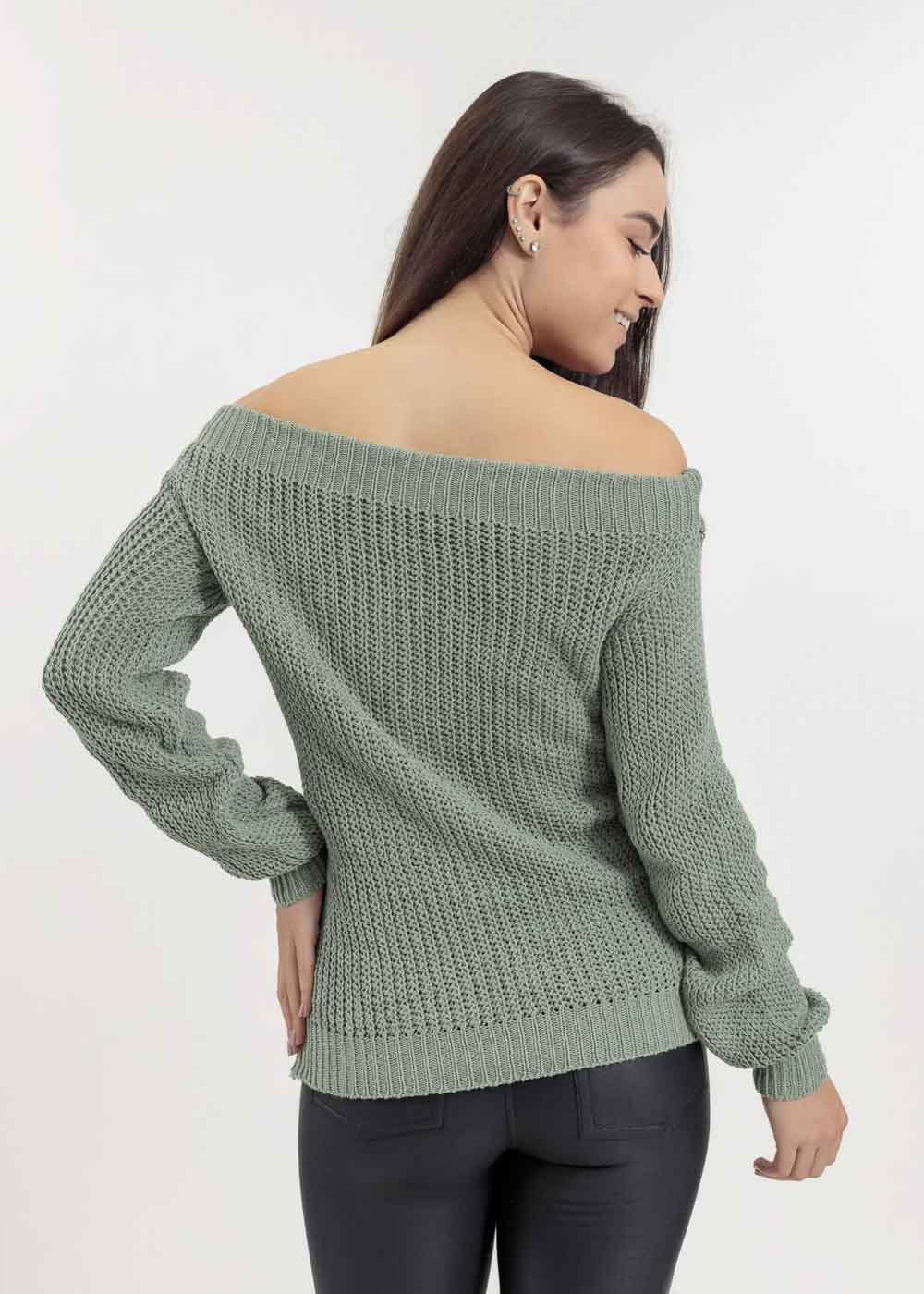 Blusa de Tricot com gola em decote ombro a ombro, comprimento mais alongado.