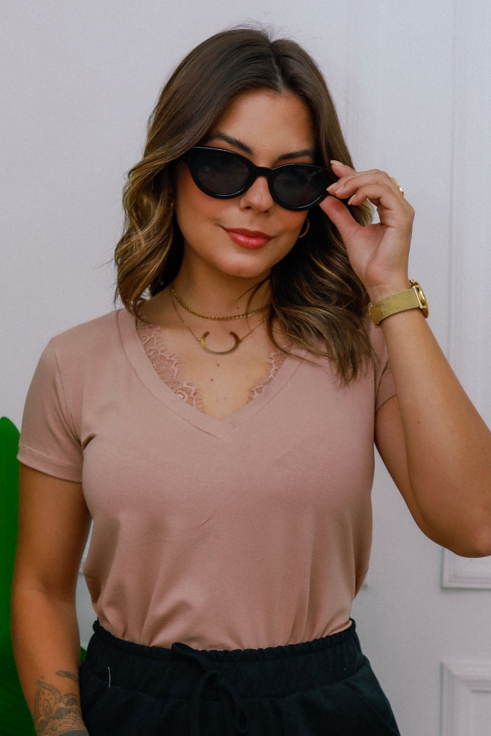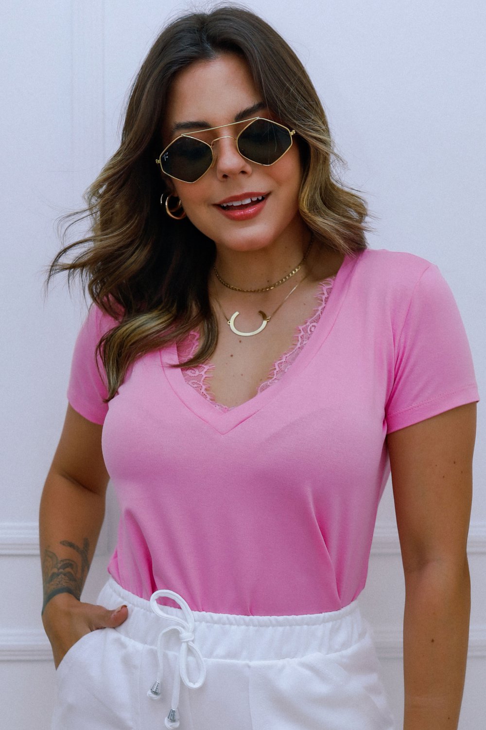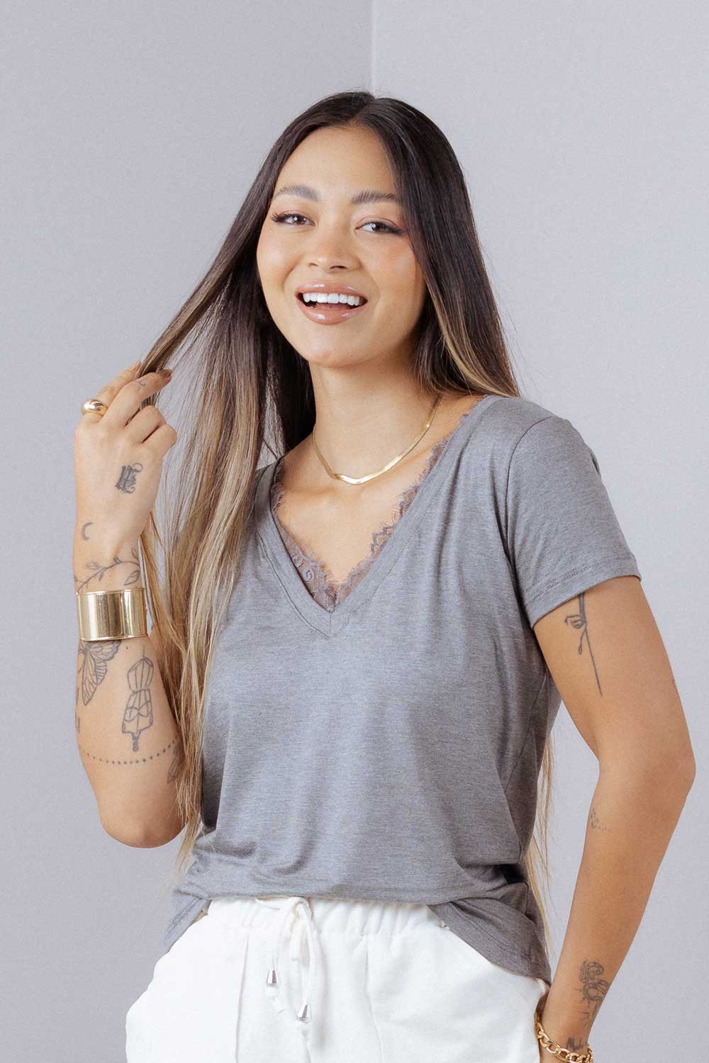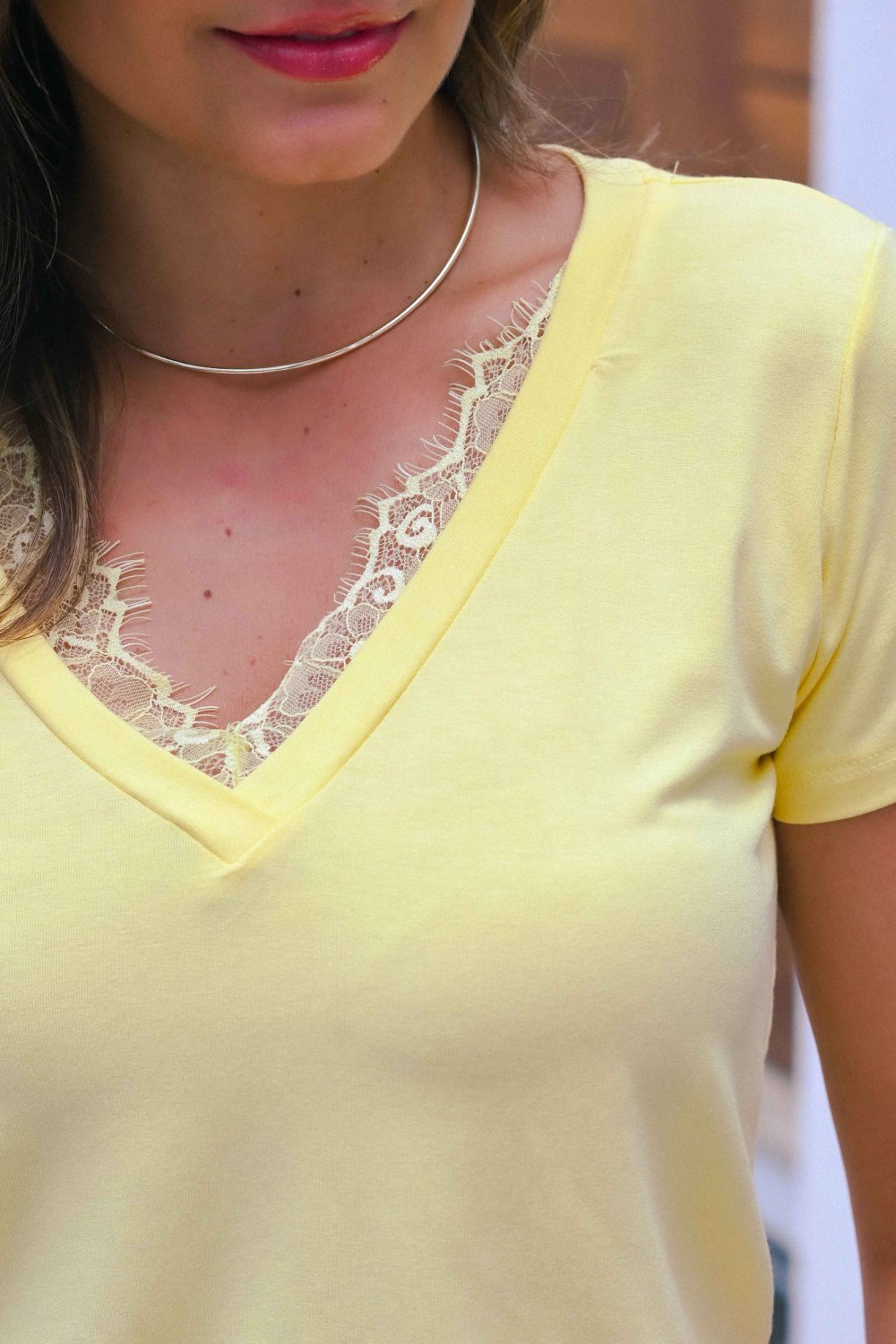 Esta blusa de viscolycra é a combinação perfeita de conforto e elegância. Com um decote em V que alonga a silhueta e uma delicada aplicação de renda, ela adiciona um toque de sofisticação a qualquer look. Versátil, pode ser usada tanto no dia a dia, combinada com jeans ou saia, quanto em ocasiões mais especiais, com acessórios e calças de alfaiataria. Uma peça chave para quem busca um visual casual-chique, com leveza e estilo.
