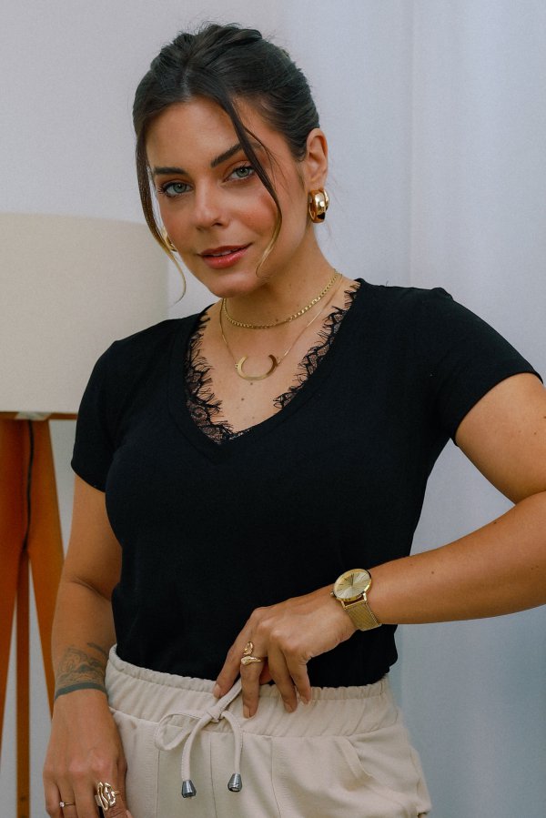 Esta blusa de viscolycra é a combinação perfeita de conforto e elegância. Com um decote em V que alonga a silhueta e uma delicada aplicação de renda, ela adiciona um toque de sofisticação a qualquer look. Versátil, pode ser usada tanto no dia a dia, combinada com jeans ou saia, quanto em ocasiões mais especiais, com acessórios e calças de alfaiataria. Uma peça chave para quem busca um visual casual-chique, com leveza e estilo.