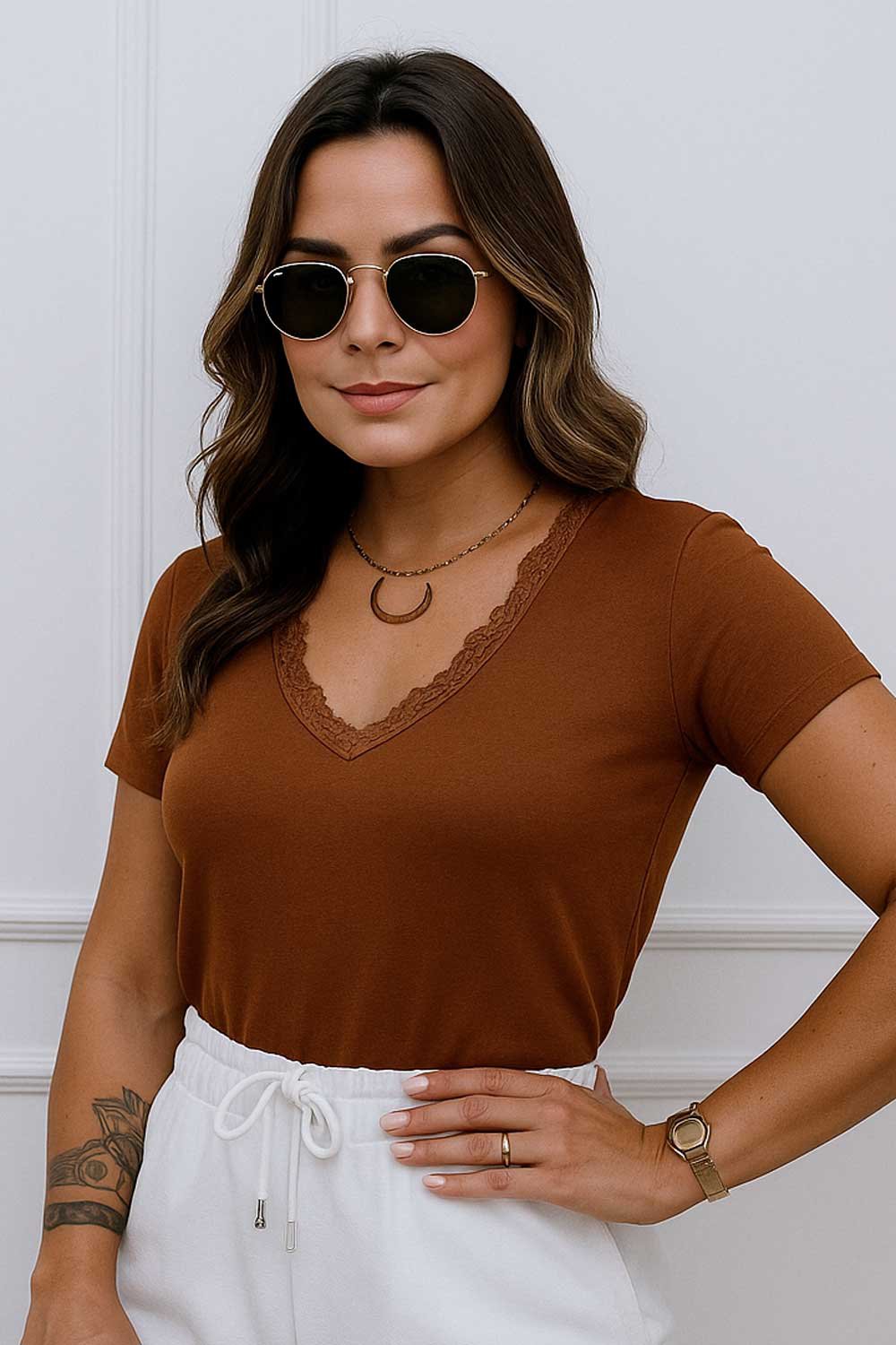 Esta blusa de viscolycra é a combinação perfeita de conforto e elegância. Com um decote em V que alonga a silhueta e uma delicada aplicação de renda, ela adiciona um toque de sofisticação a qualquer look. Versátil, pode ser usada tanto no dia a dia, combinada com jeans ou saia, quanto em ocasiões mais especiais, com acessórios e calças de alfaiataria. Uma peça chave para quem busca um visual casual-chique, com leveza e estilo.