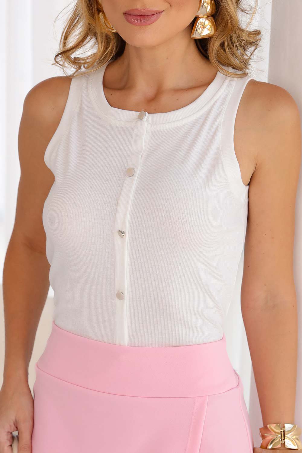 Confeccionada em ribana canelada de toque macio, ela é perfeita para dias quentes e composições elegantes, seja com saias, shorts ou calças. Um detalhe especial: o primeiro botão próximo à gola é funcional — ideal para ajustar conforme seu gosto.