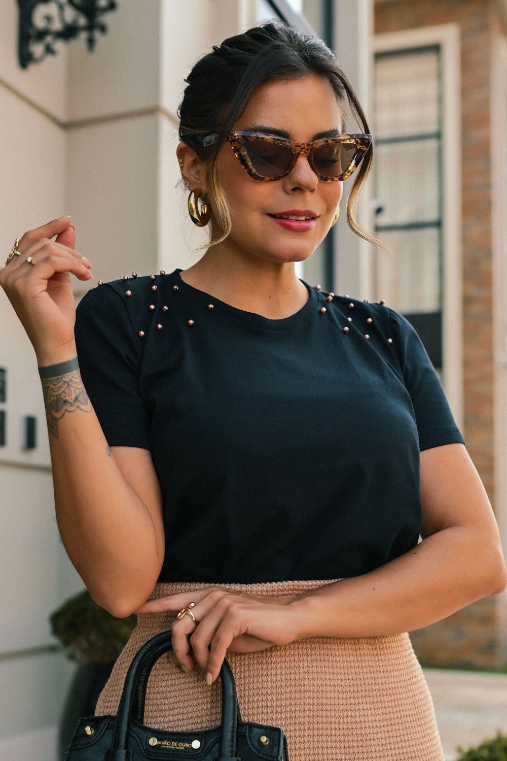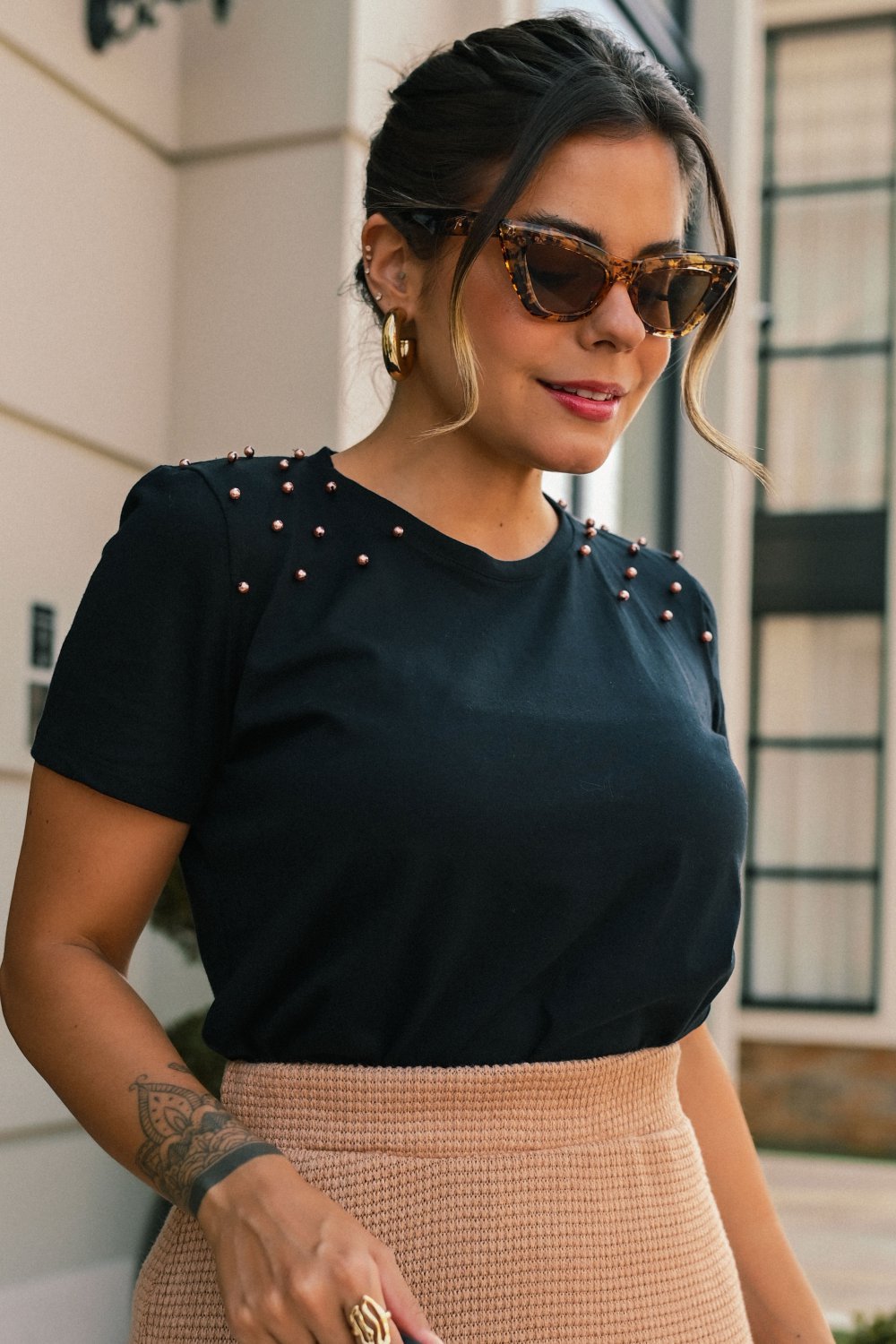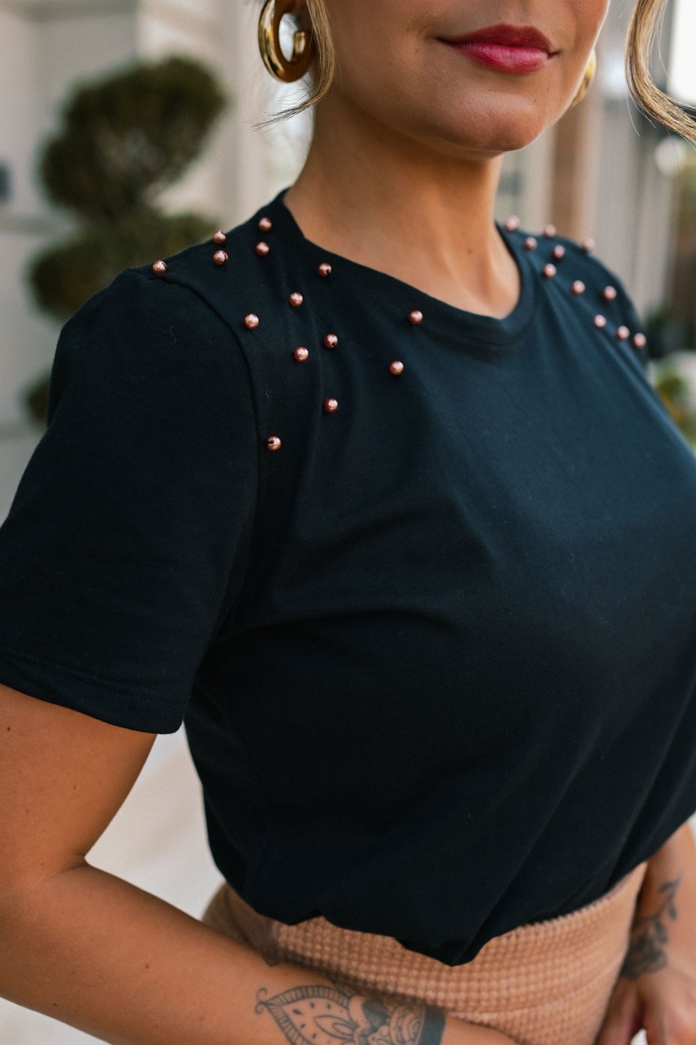 Decote redondo, proporcionando um ajuste confortável e elegante e com aplicação de pérolas delicadas na parte frontal, que adiciona um charme especial à peça.