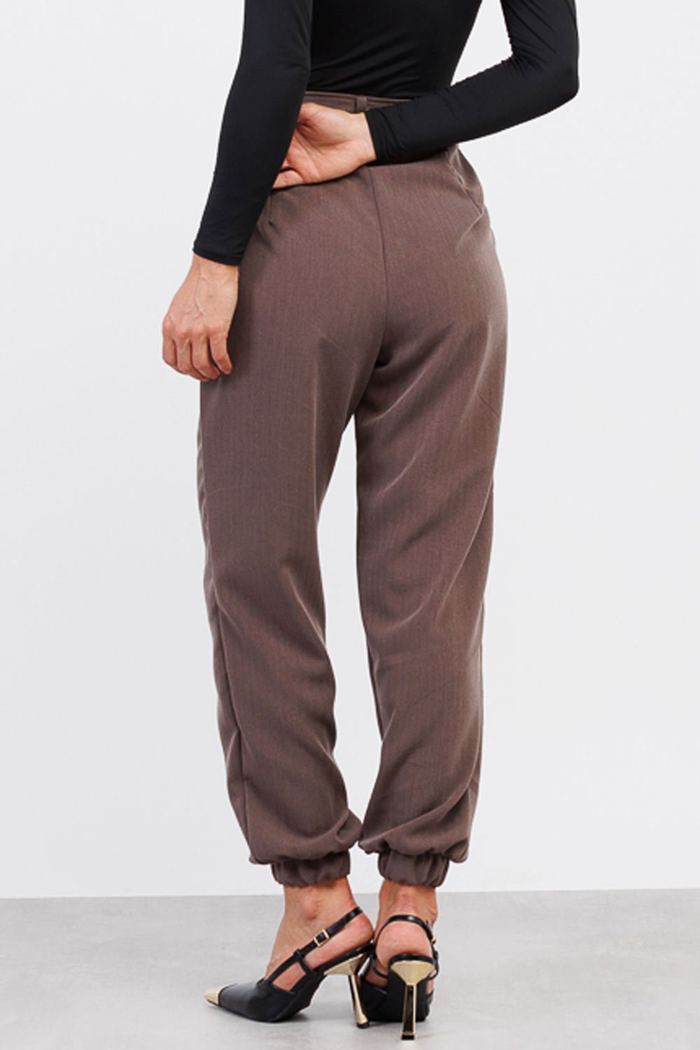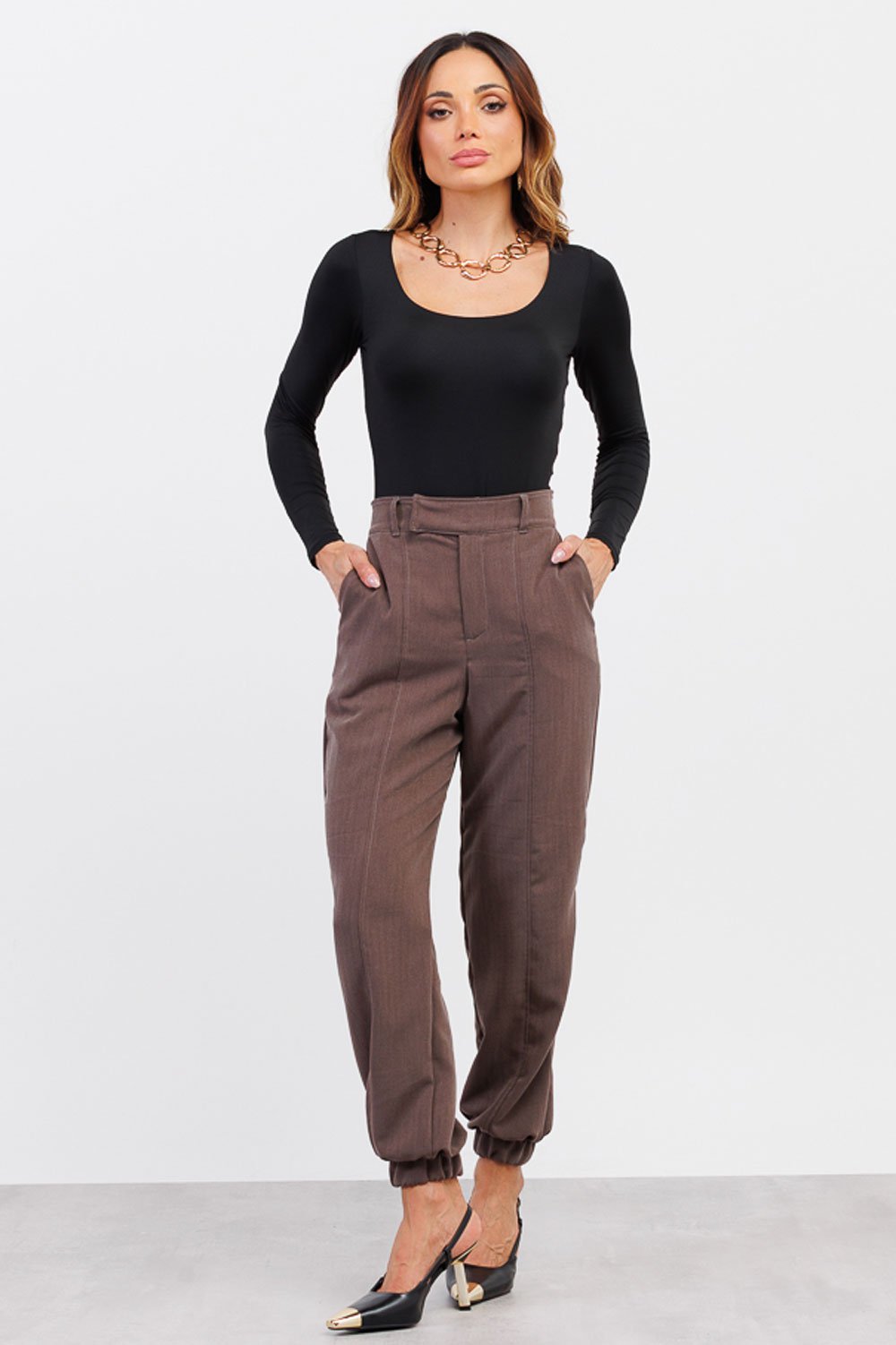 Confeccionada em tecido leve e confortável, a peça possui cintura estruturada que valoriza a silhueta e proporciona um caimento alinhado. A modelagem com leve afunilamento e elástico no tornozelo traz um toque contemporâneo à alfaiataria clássica, criando um visual atual e extremamente prático.