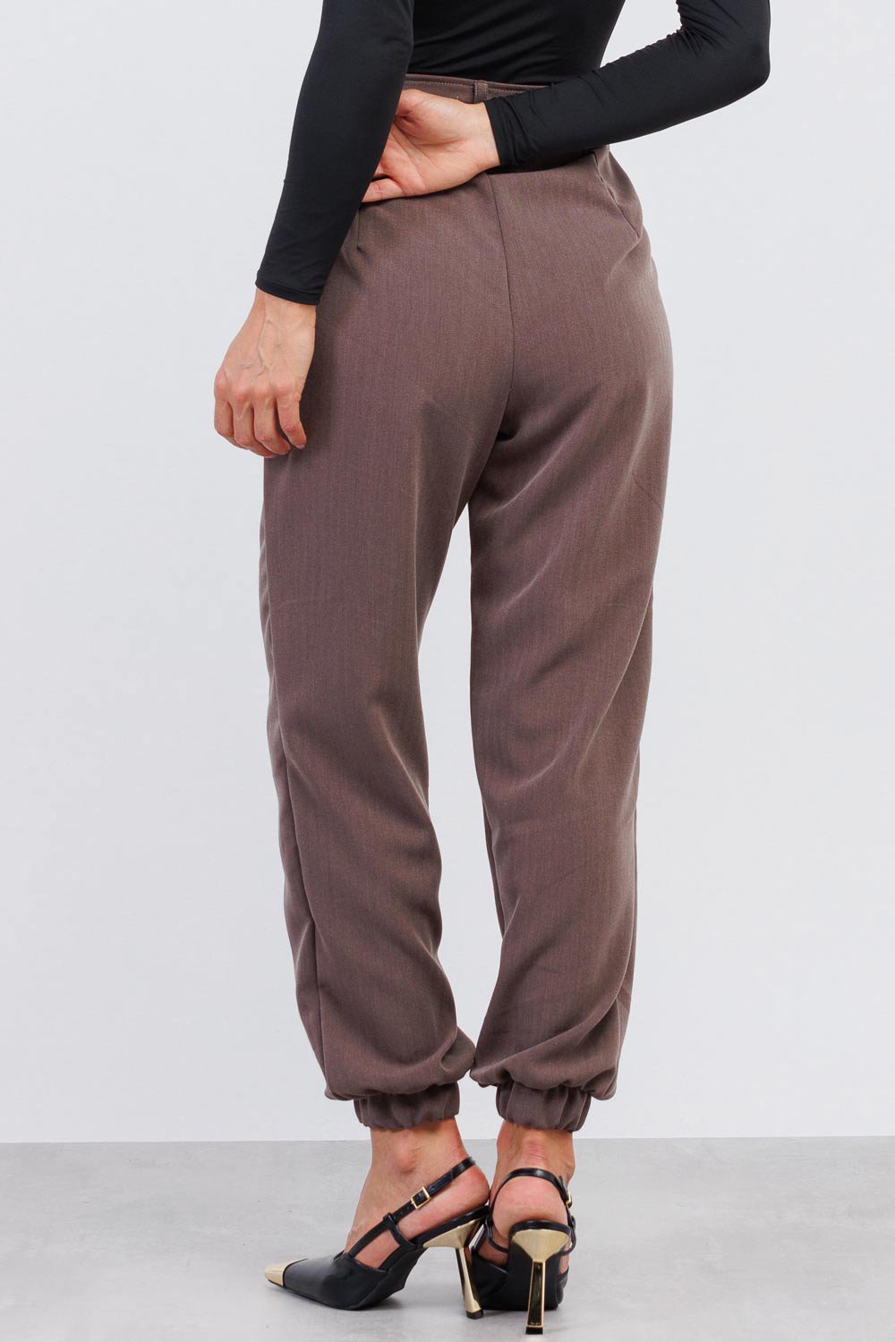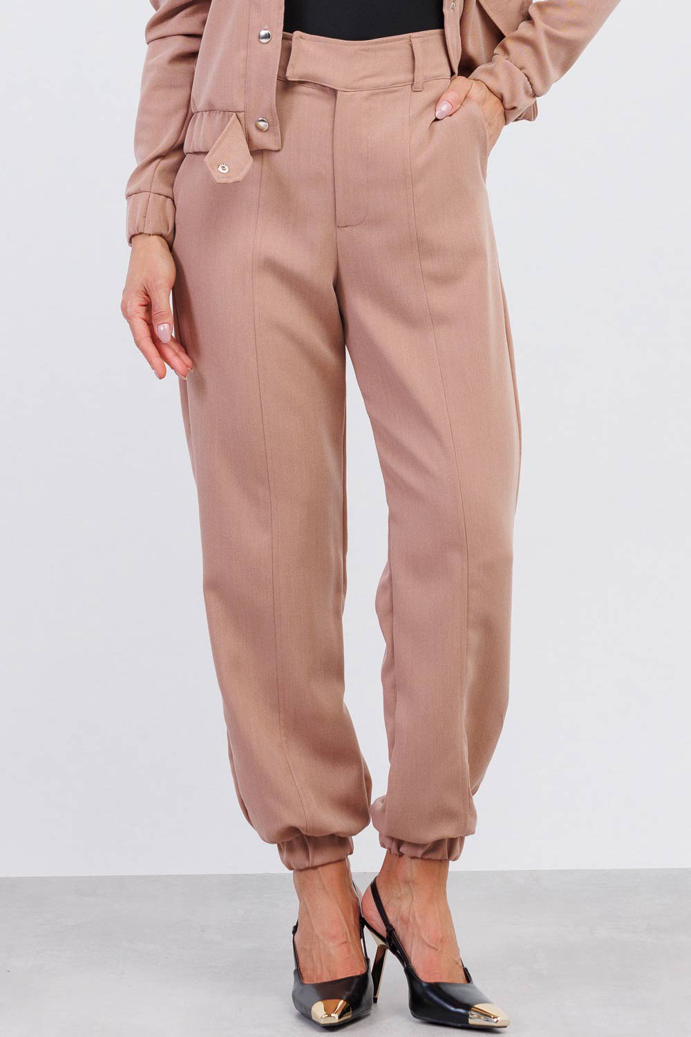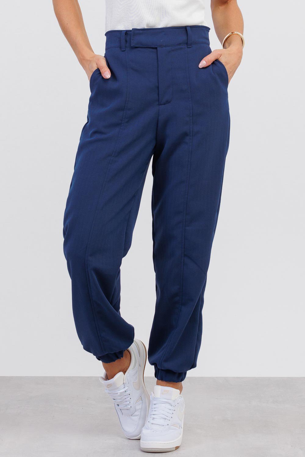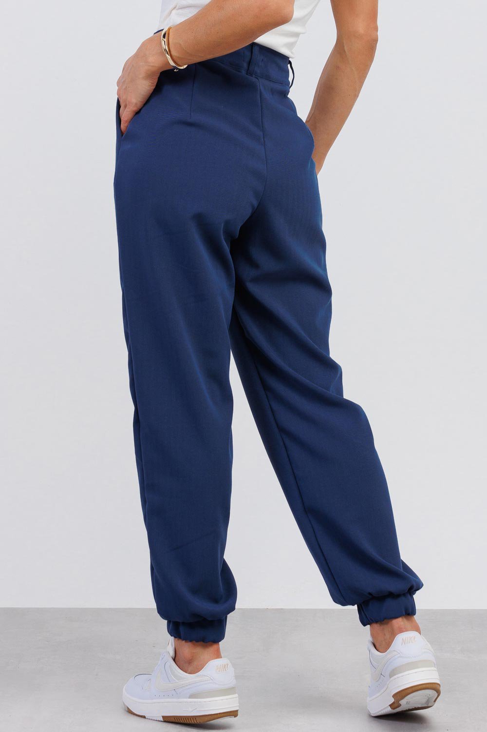 Confeccionada em tecido leve e confortável, a peça possui cintura estruturada que valoriza a silhueta e proporciona um caimento alinhado. A modelagem com leve afunilamento e elástico no tornozelo traz um toque contemporâneo à alfaiataria clássica, criando um visual atual e extremamente prático.