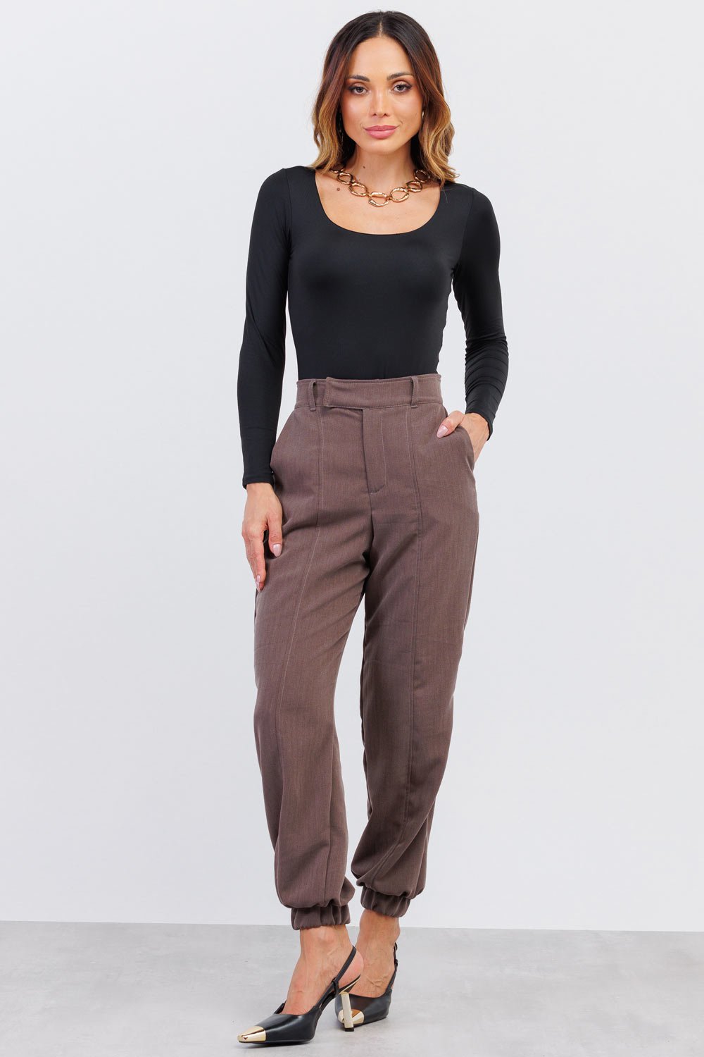 A Calça Alana é uma peça curinga no guarda-roupa. Combine com blusas ajustadas, camisas ou bodies para um visual elegante no trabalho, ou aposte em tênis e peças mais casuais para um look urbano moderno.