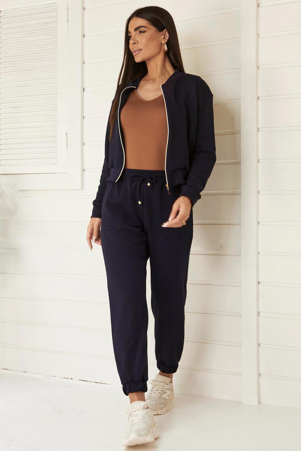 Composto por jaqueta e calça, o conjunto cria uma proposta urbana e versátil. A jaqueta possui modelagem moderna com fechamento frontal em zíper, trazendo um visual clean e atual. A calça apresenta modelagem jogger com cós elástico e punho na barra, garantindo ajuste confortável e um caimento que valoriza a silhueta.