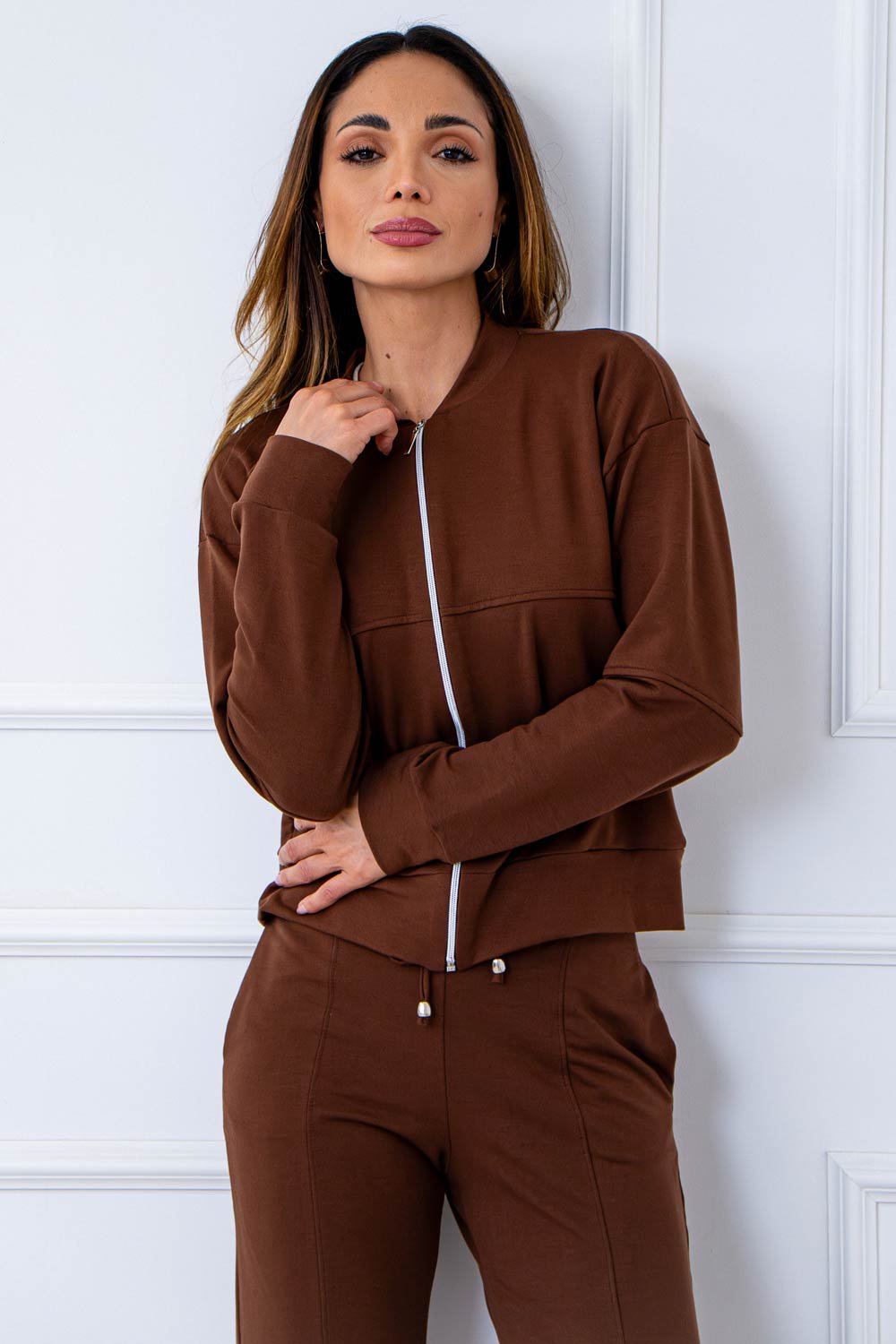A jaqueta possui modelagem levemente ajustada com fechamento frontal em zíper, criando um visual clean e contemporâneo. A calça estilo pantalona traz cós elástico com amarração, garantindo ajuste confortável e um caimento moderno que valoriza a silhueta.