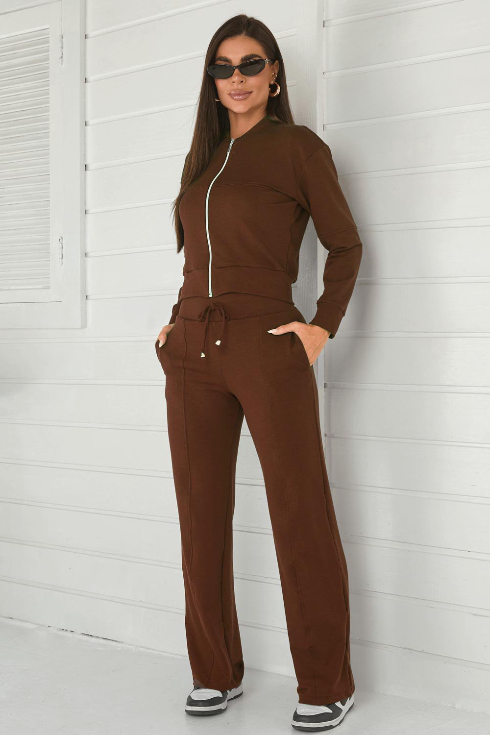 A jaqueta possui modelagem levemente ajustada com fechamento frontal em zíper, criando um visual clean e contemporâneo. A calça estilo pantalona traz cós elástico com amarração, garantindo ajuste confortável e um caimento moderno que valoriza a silhueta.