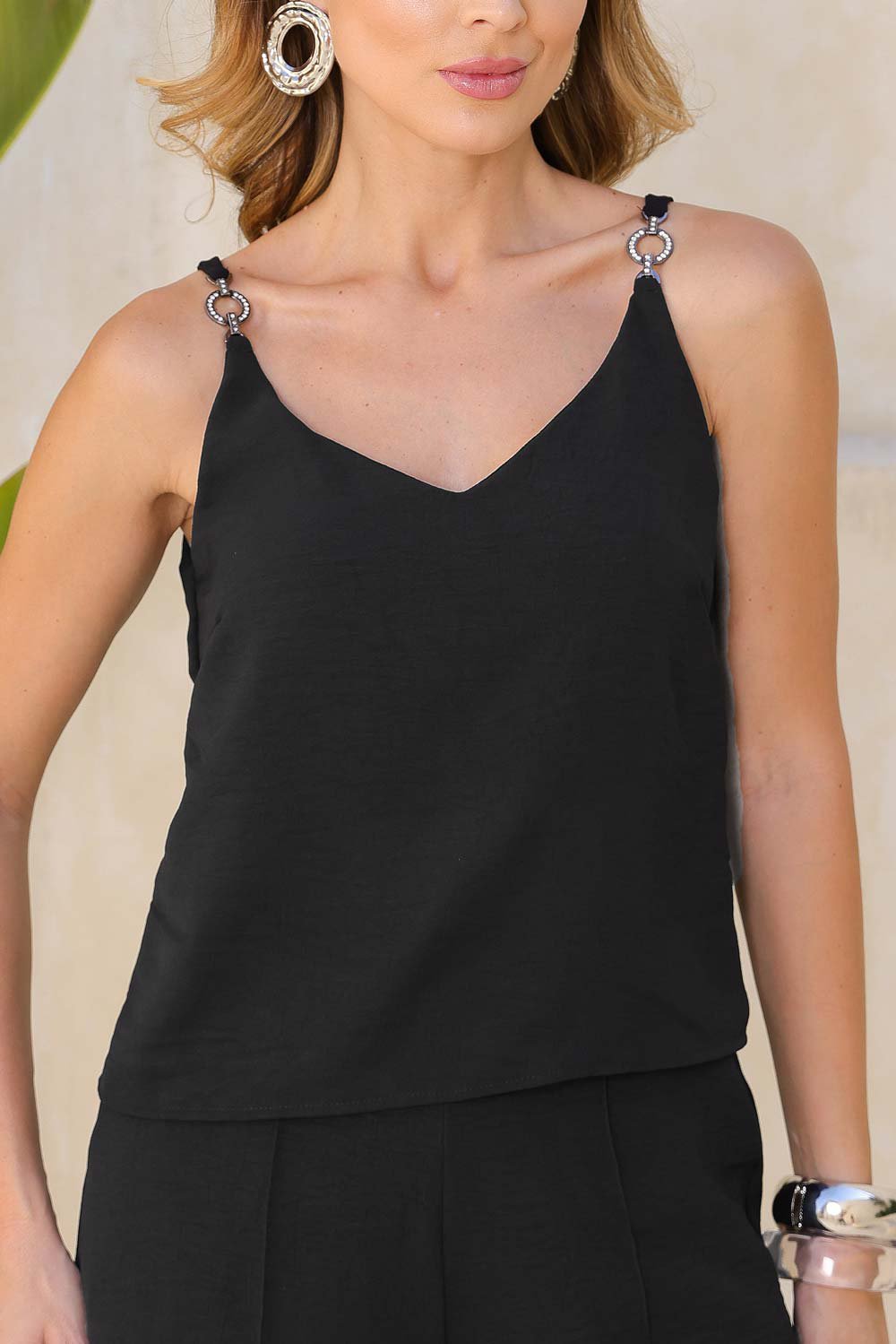 O Conjunto Giovana é a tradução do frescor com elegância. A blusa traz um caimento leve e soltinho com decote em V e alças finas, finalizadas por argolas metálicas que adicionam charme ao visual. O short possui cintura alta com cós largo e bolsos funcionais, garantindo conforto e praticidade para o dia a dia.