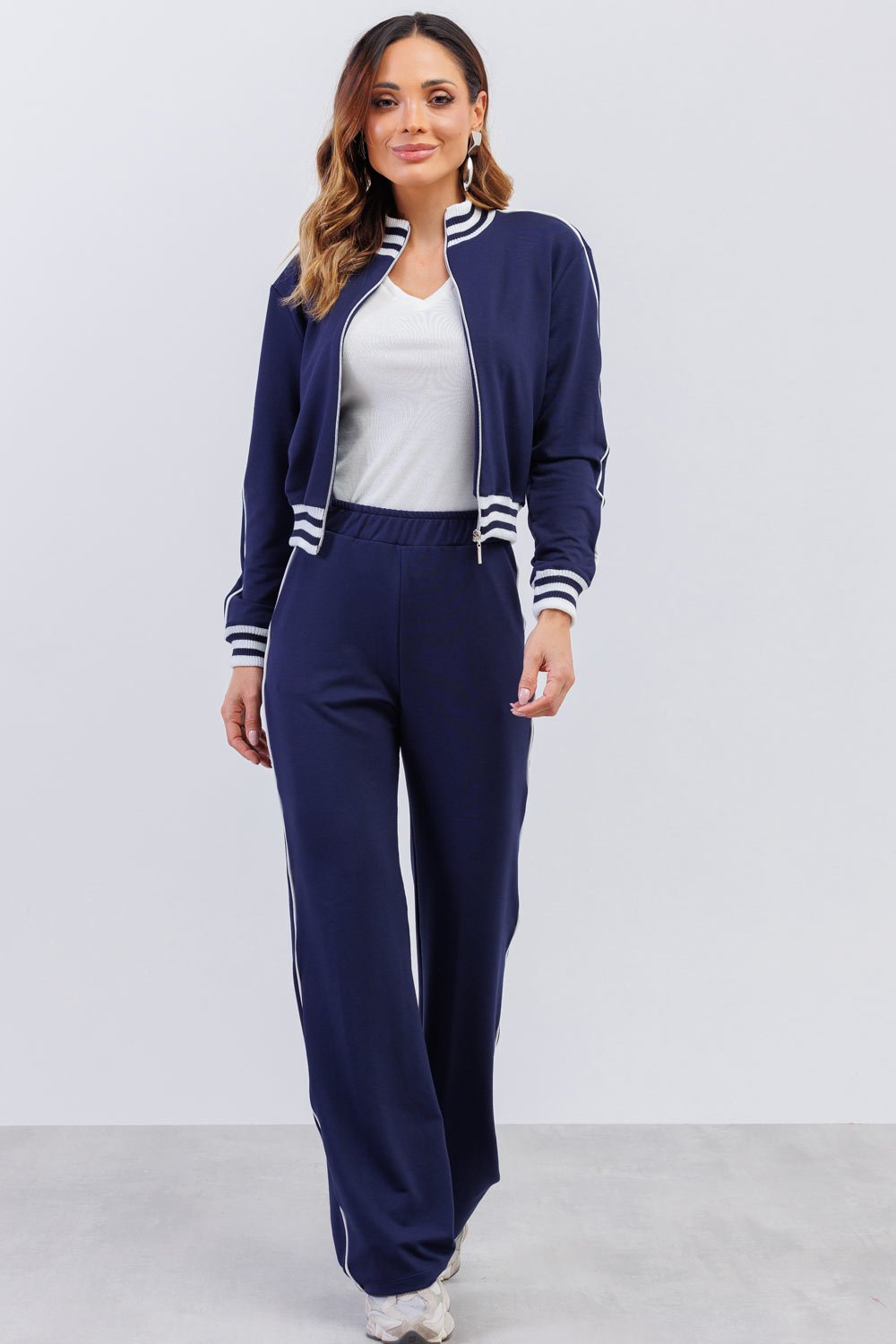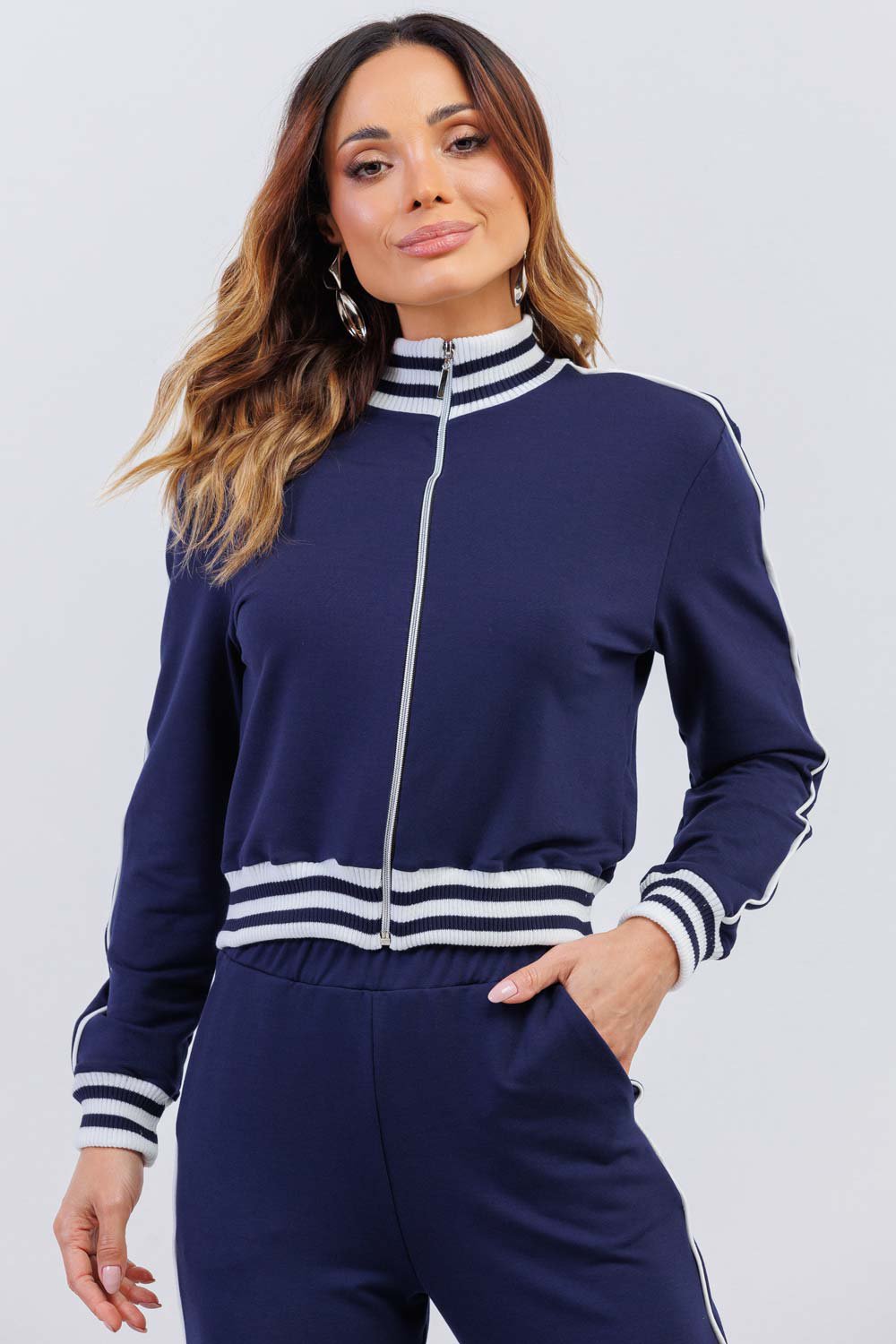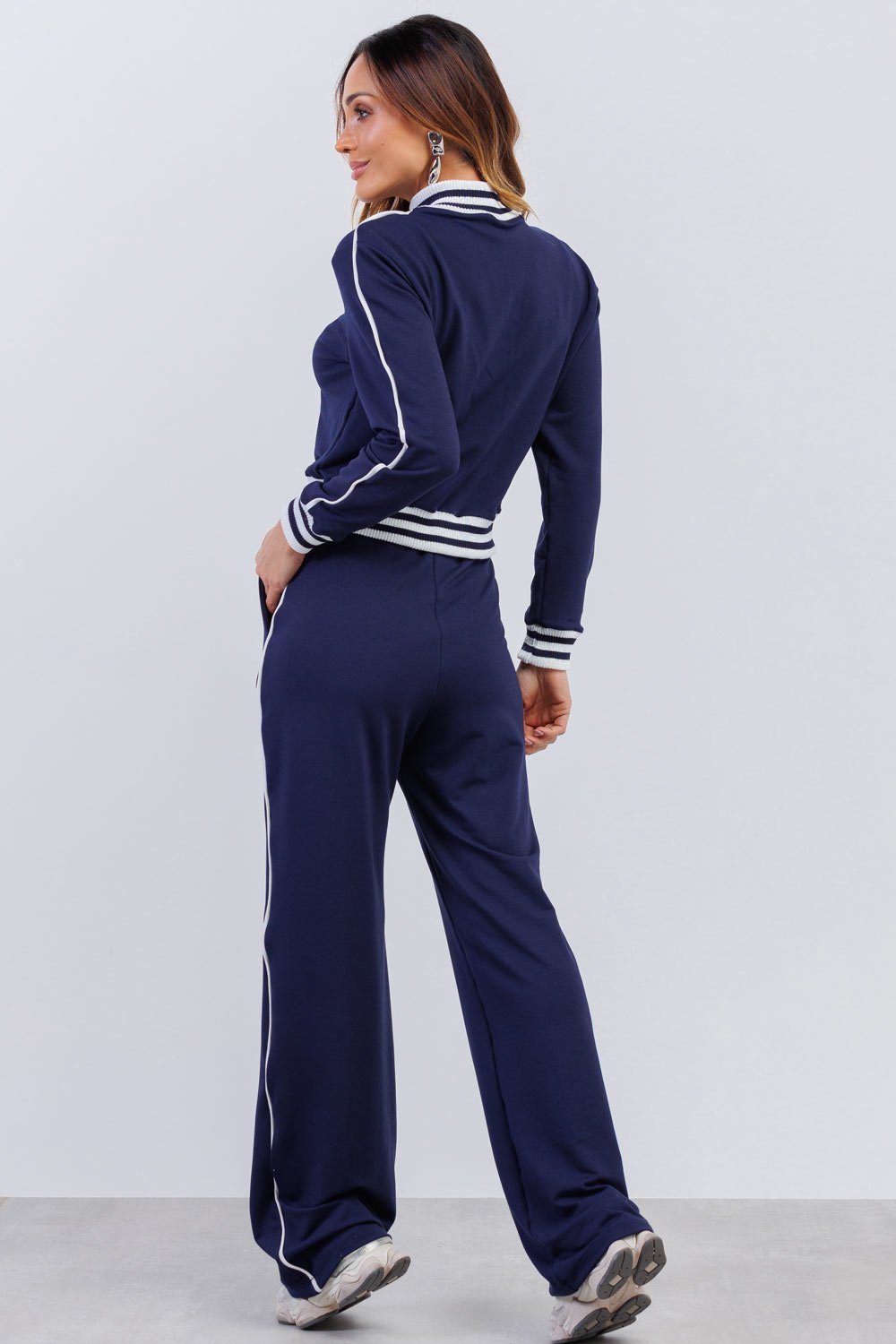 Confeccionado em molecotton, possui toque macio, leve elasticidade e caimento confortável. A jaqueta com zíper frontal e gola alta traz um ar esportivo sofisticado, enquanto os detalhes em listras nos punhos e na barra elevam o acabamento. A calça com modelagem fluida conta com bolsos funcionais e detalhe lateral que alonga a silhueta.