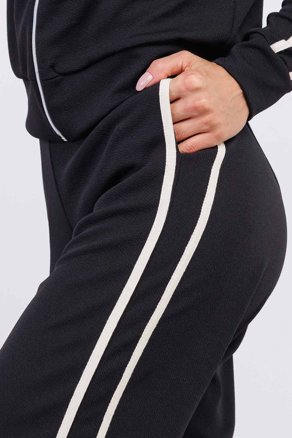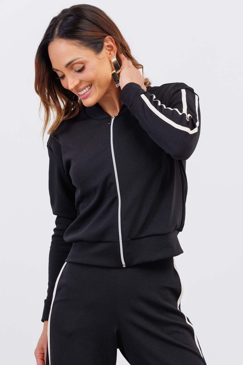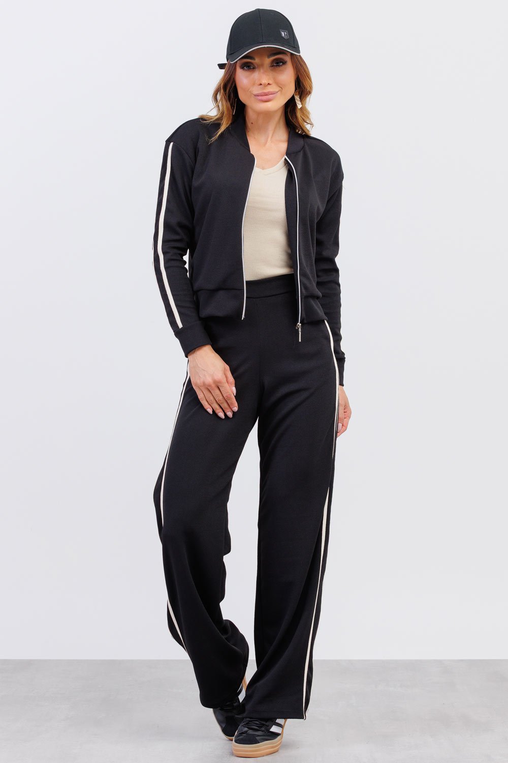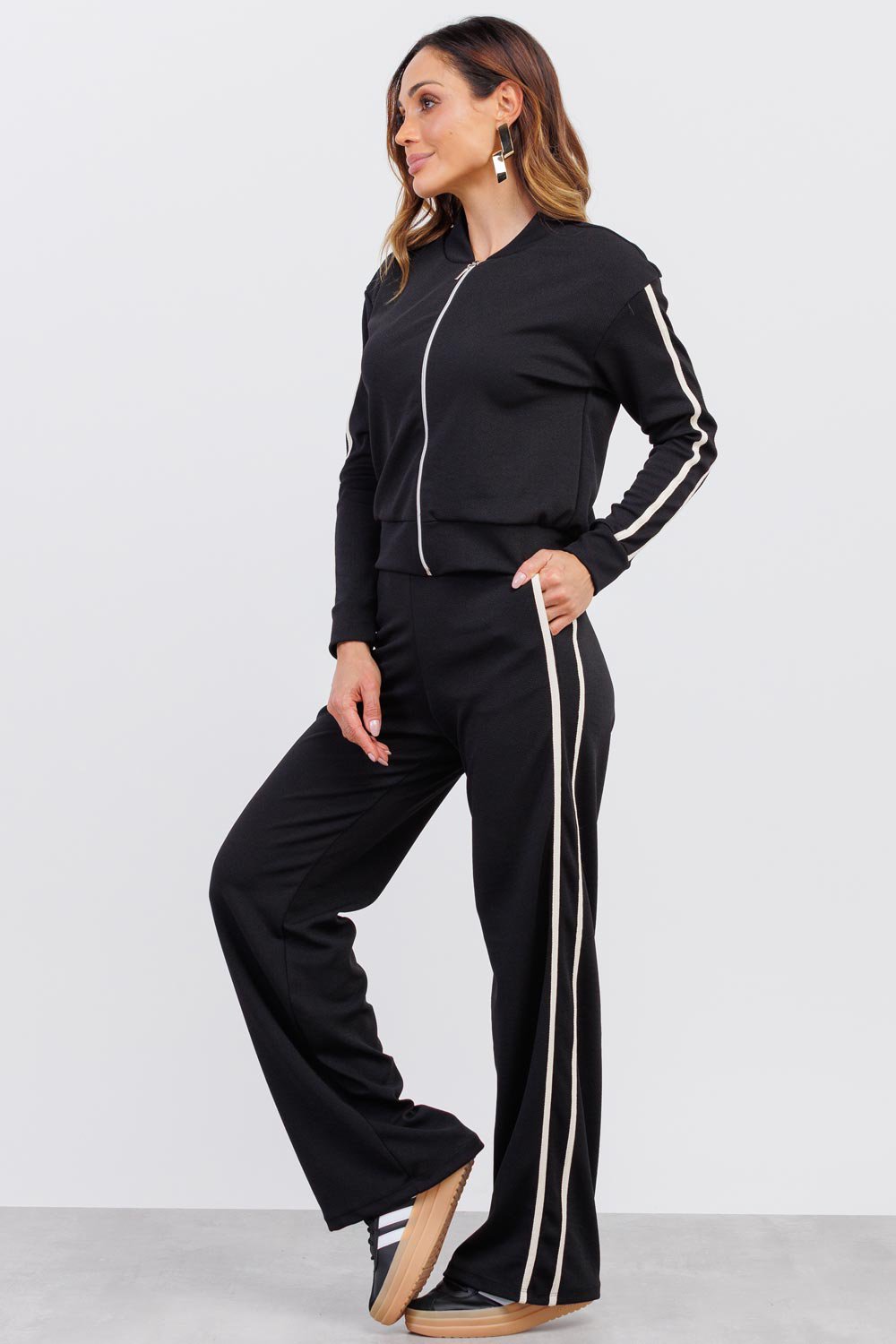 O Conjunto Helena é a escolha perfeita para quem busca um visual moderno e elegante sem abrir mão do bem-estar. Confeccionado em malha encorpada de toque macio, ele é composto por jaqueta com zíper frontal e calça de modelagem reta, ambas com detalhes em listras laterais que alongam a silhueta e garantem um ar esportivo chic.