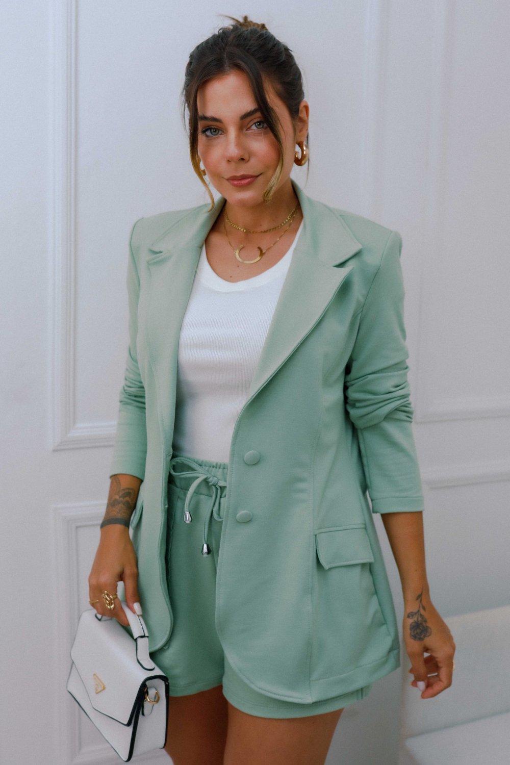 O blazer possui comprimento alongado, detalhes em lapela na parte frontal, ombreiras para dar estrutura e botões forrados.