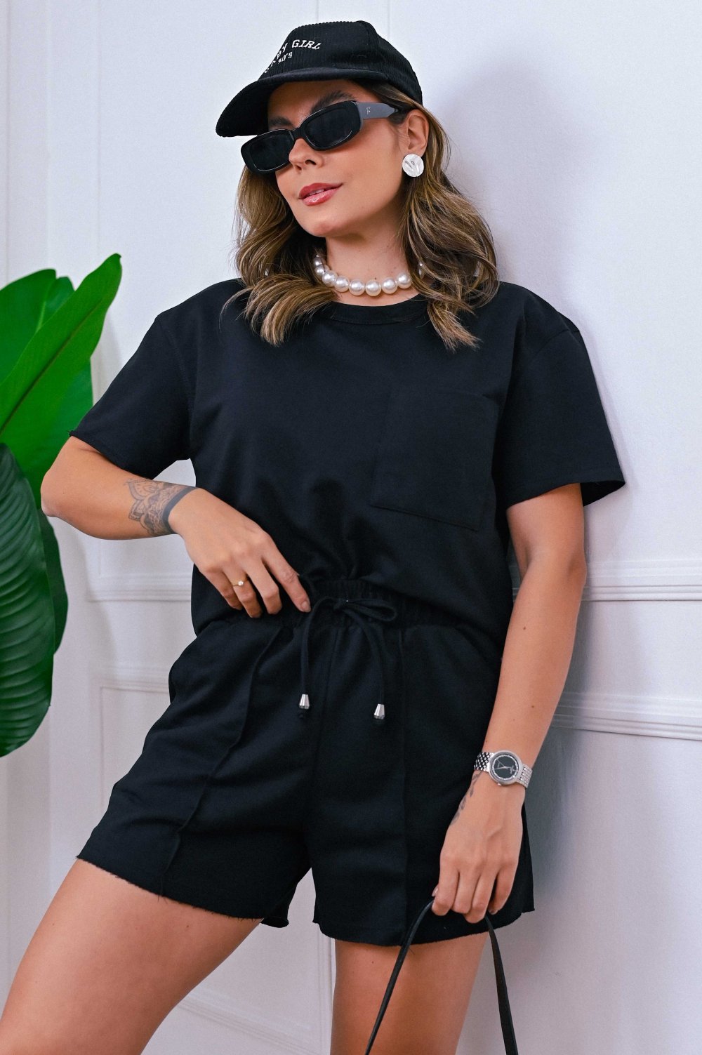 Ele é composto por uma blusa de manga curta com detalhe de bolso, enquanto o shorts combina praticidade e estilo com seus bolsos laterais, elástico na cintura e cordão decorativo com ilhós.