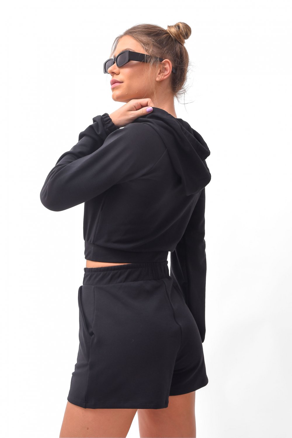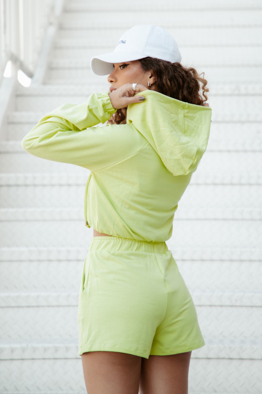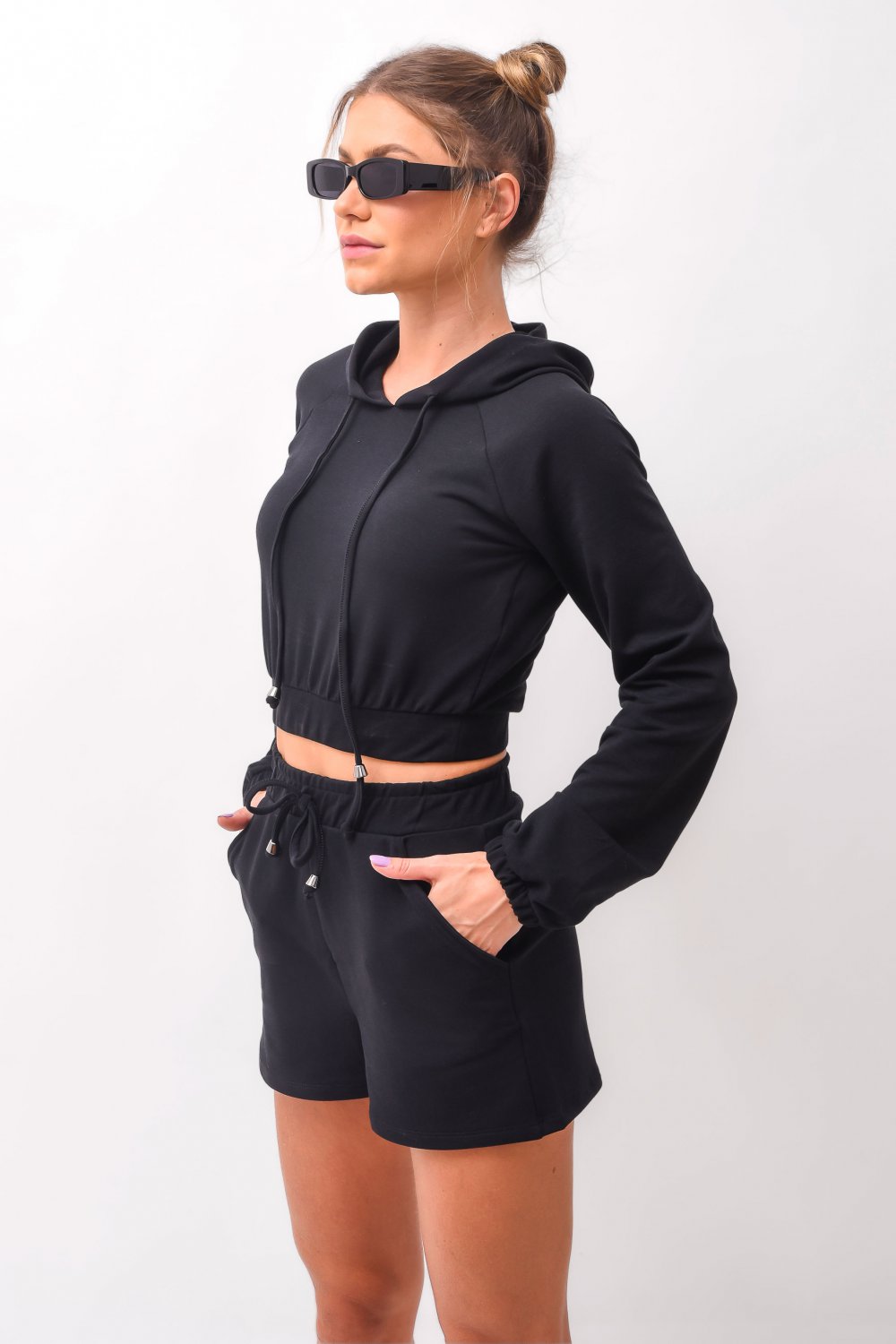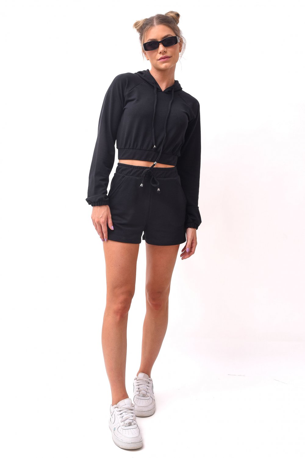 A blusa cropped possui capuz finalizado com cordão da mesma variante e ponteiras.