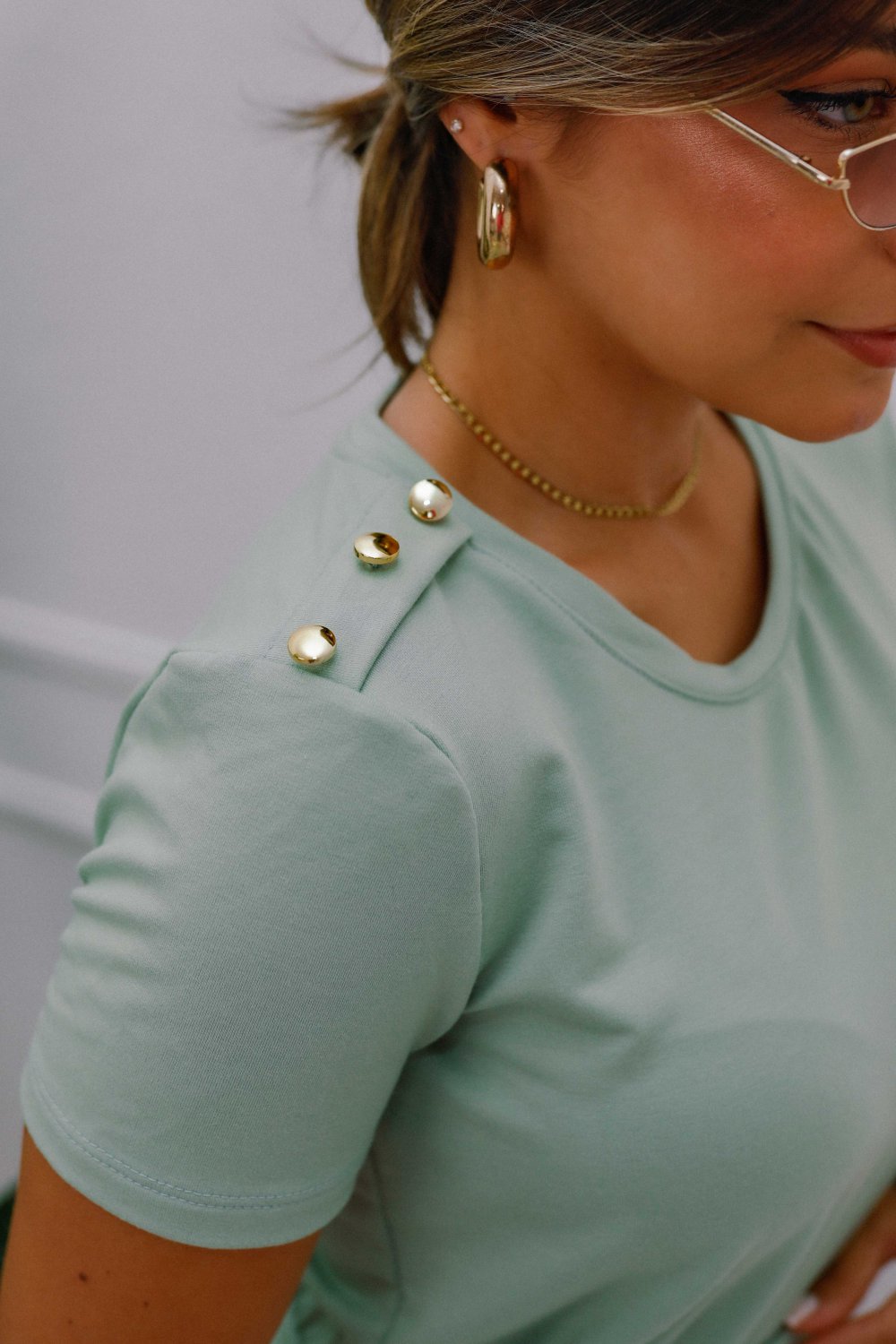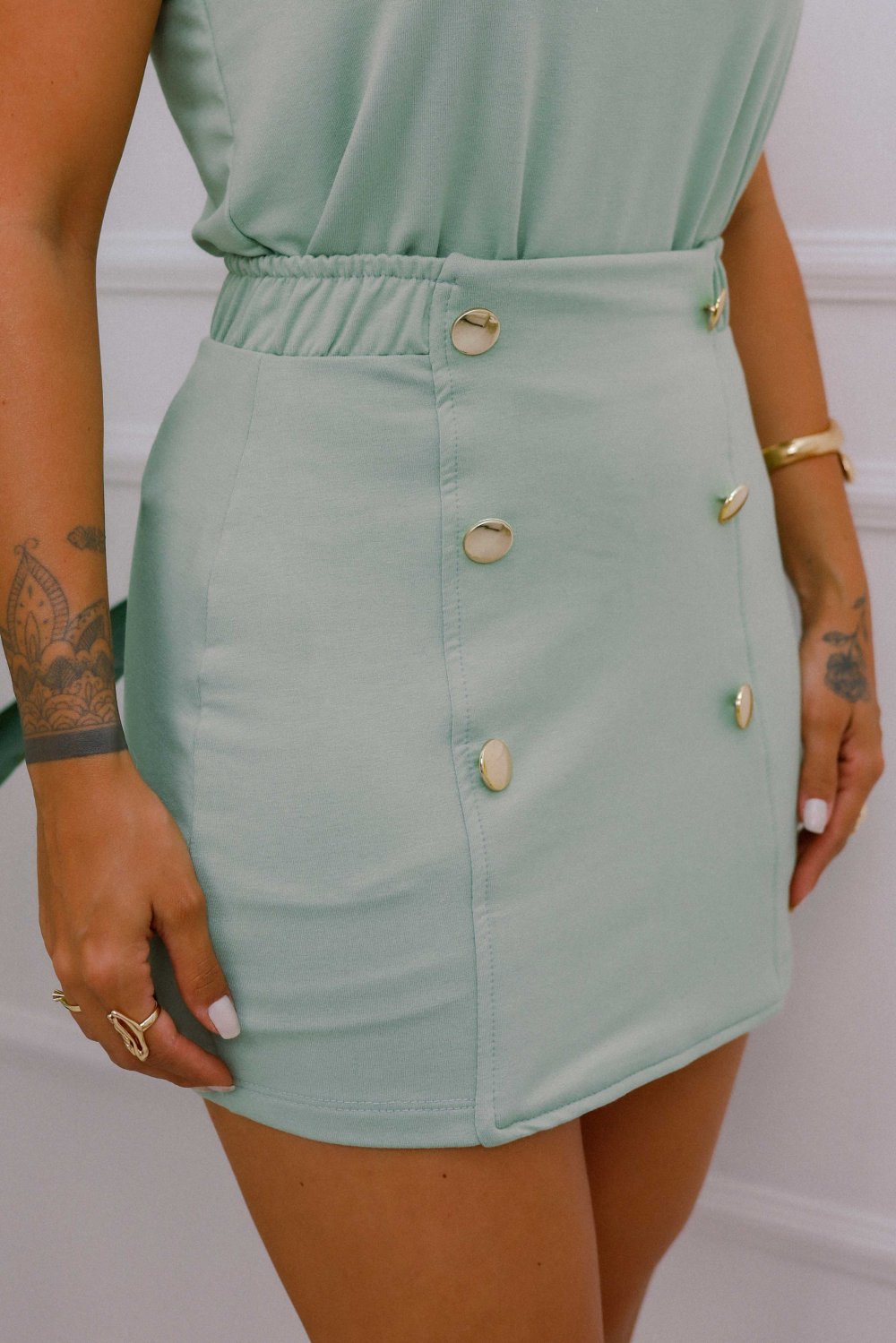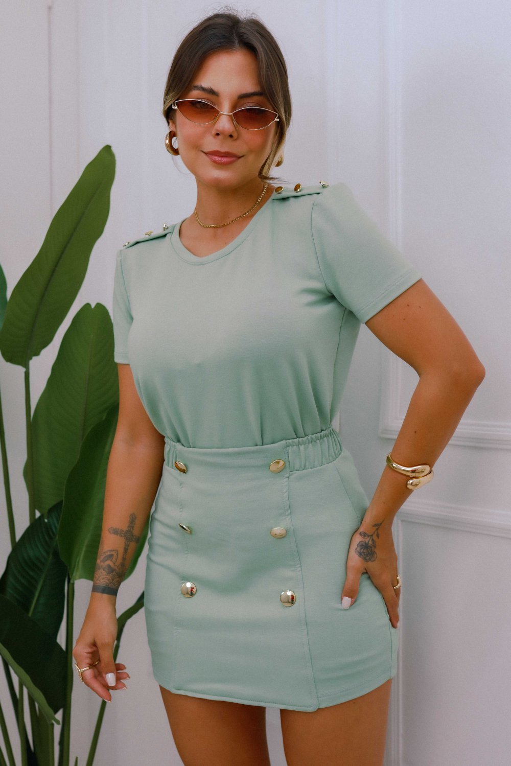 Este conjunto é composto por uma blusa de manga curta com decote redondo, dando destaque aos detalhes de botões no ombro que adicionam um toque sofisticado. O shorts saia possui o detalhe de botões frontais com elástico na cintura, que garante um ajuste confortável e possui forro.