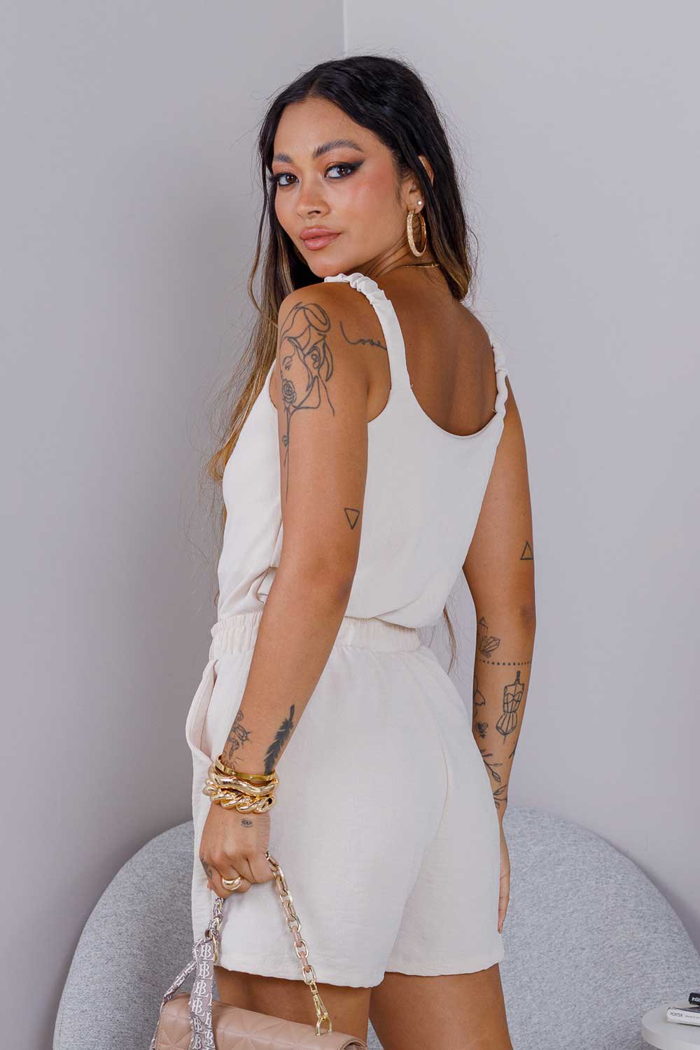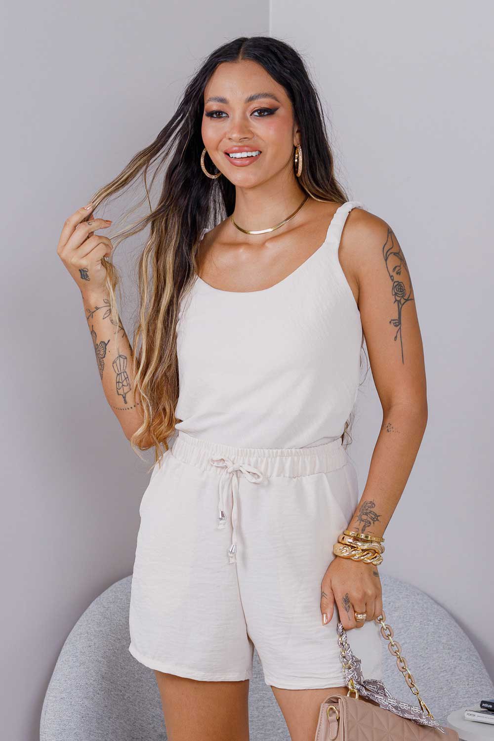 O conjunto feminino curto Nina pode ser usado de diversas formas. Combine com sandálias para um look descontraído, tênis para um visual moderno ou salto para um toque sofisticado.