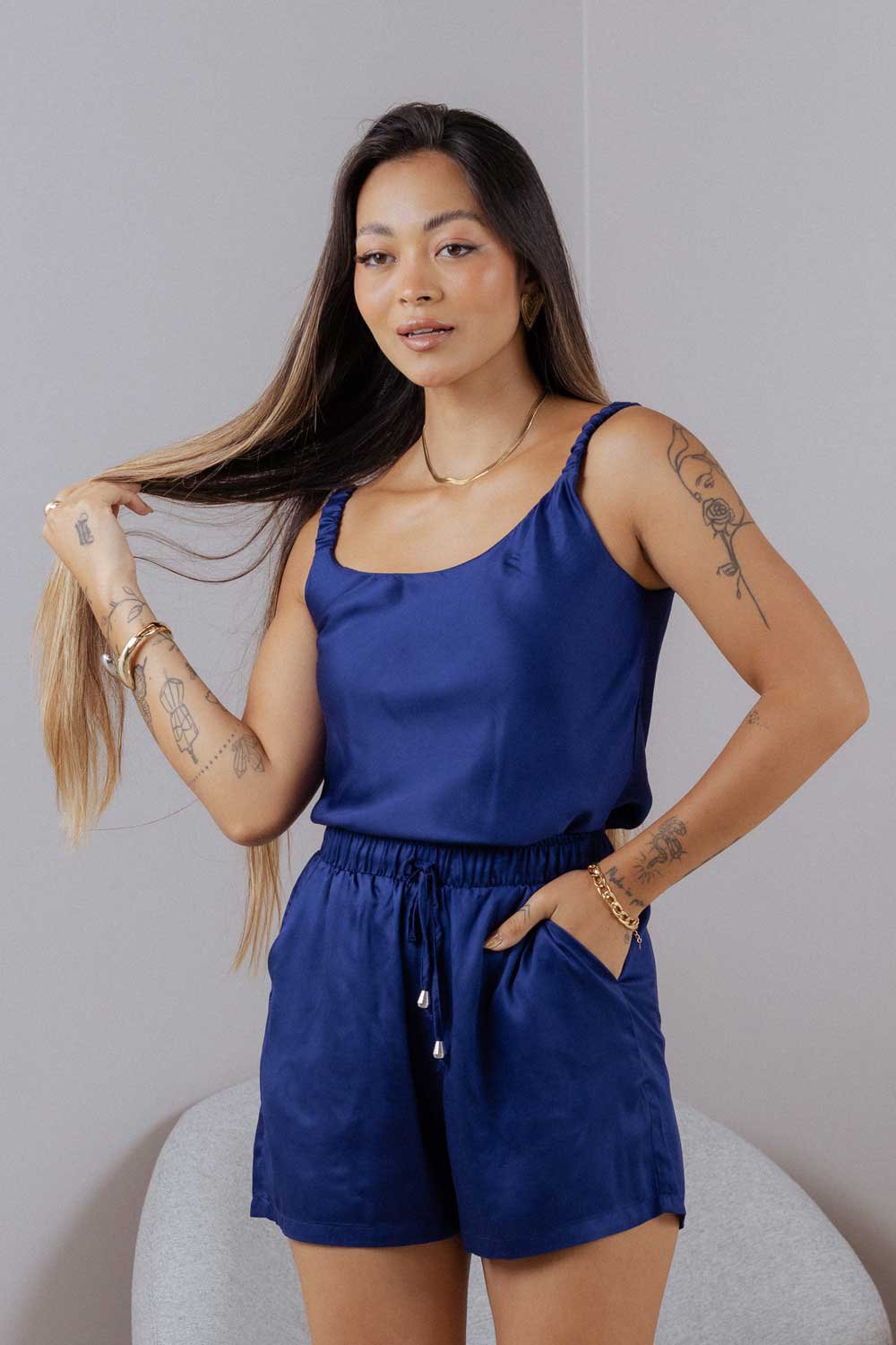 Esse look pode ser facilmente adaptado para diferentes contextos: do passeio ao ar livre à um encontro descontraído, ou até mesmo um dia mais informal no trabalho. A combinação de peças frescas e confortáveis com detalhes de design inteligente faz dele uma opção versátil, que vai bem com tênis, sandálias ou até um salto dependendo da ocasião.