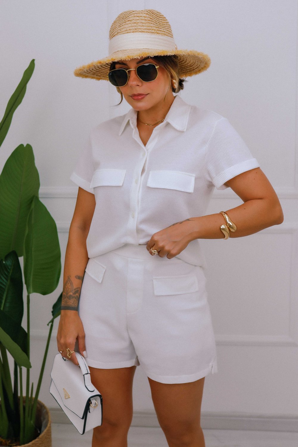 Detalhe de lapela: Charme adicional na blusa e no shorts.
