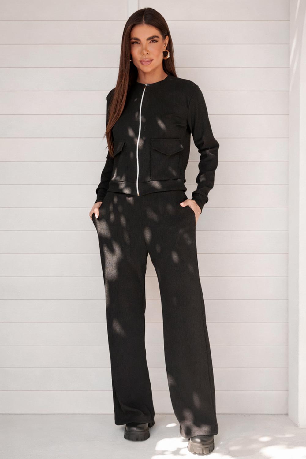 Composto por jaqueta e calça, o conjunto entrega um visual elegante e contemporâneo. A jaqueta possui modelagem moderna com fechamento frontal em zíper e bolsos frontais que adicionam praticidade e estilo à peça. A calça apresenta cós liso na parte frontal e modelagem estilo pantalona, proporcionando um caimento fluido que alonga a silhueta e traz ainda mais sofisticação ao look.