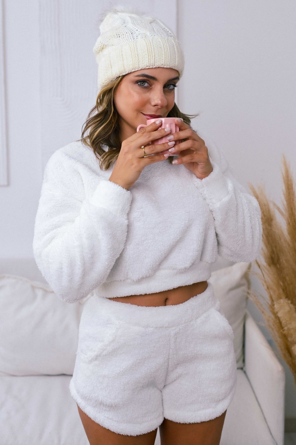 Nosso pijama Dandara produzido em pelo, super quentinho e confortável é composto por um cropped de manga longa e shorts.