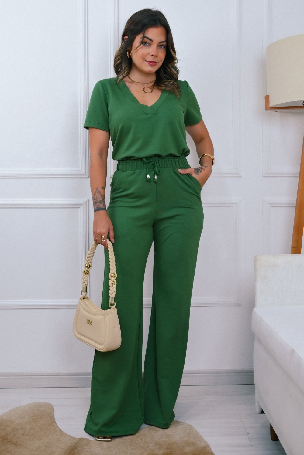 Este conjunto feminino é composto por uma blusa de manga curta com decote em V.