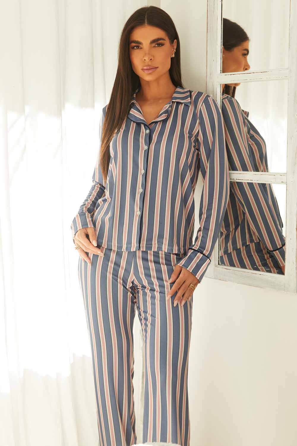 Conforto que acompanha sua rotina. O Pijama Sonia combina elegância e aconchego em uma proposta moderna. Confeccionado em malha suede, possui toque extremamente macio e caimento leve no corpo. A camisa com abertura frontal, gola clássica e manga longa traz um visual alinhado e sofisticado, enquanto a calça com modelagem confortável garante liberdade e praticidade no uso diário.